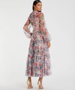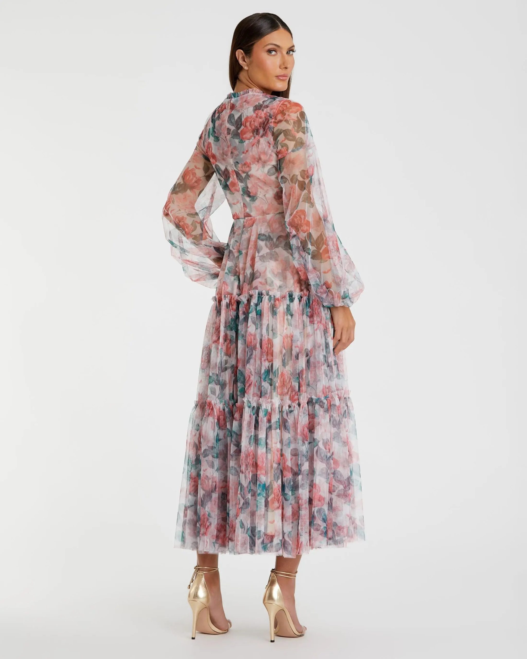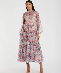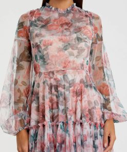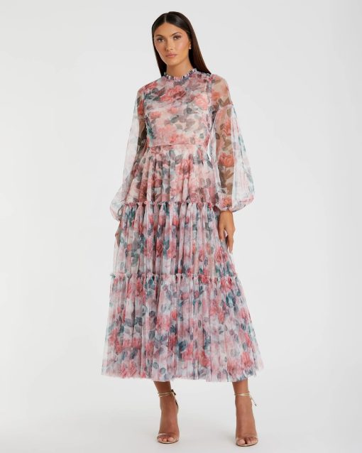 This midi dress boasts a high neckline and long balloon sleeves, adding sophistication to your look. With its delicate floral print on chiffon fabric, it brings a touch of romance to any occasion. Perfect for special events or garden parties.