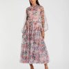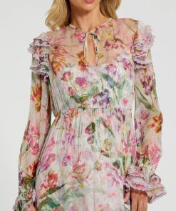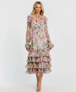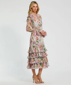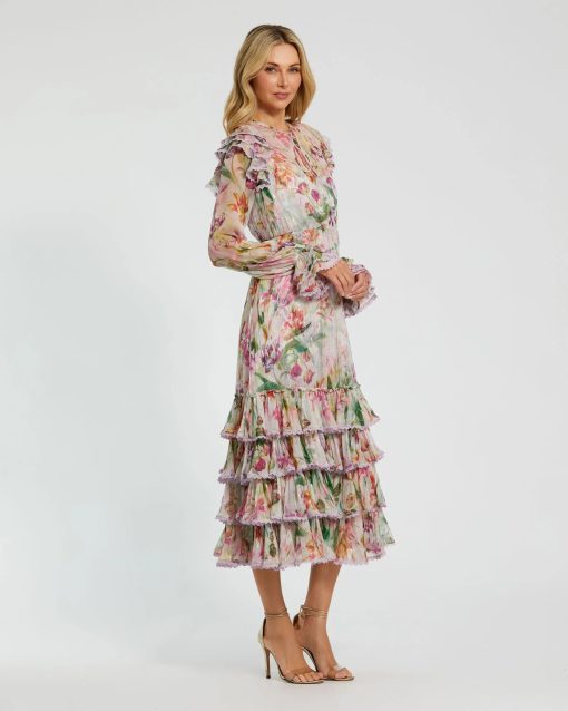 This chic shift dress features ruffled shoulders and sleeve cuffs, while the vibrant floral print and tiered ruffle skirt create a graceful, flirty silhouette that effortlessly blends elegance with playfulness—ideal for brunches, daytime events, or garden parties.