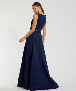 This sleeveless a-line gown boasts a boat neckline and an elegantly embellished bodice. Delicate floral details and a flowing silhouette make this gown a timeless and sophisticated choice for any special occasion.
