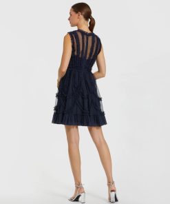 This charming mini dress features a high neckline, sleeveless design, and allover ruffle detail for a chic, playful look. Perfect for daytime occasions, it effortlessly blends elegance with a fun twist.
