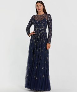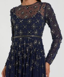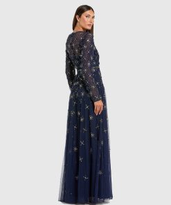 Mac Duggal Women’s Dresses Navy Long Sleeve Crystal Embellished Evening Gown | Midnight