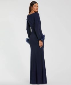 Mac Duggal Women’s Dresses Navy Long Sleeve Fitted Jersey Gown With 3d Flowers | Navy