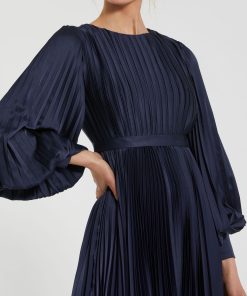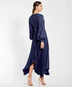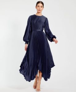 Mac Duggal Women’s Dresses Navy Long Sleeve Pleated Charmeuse Handkerchief Dress | Navy