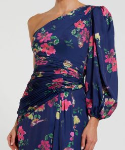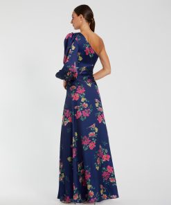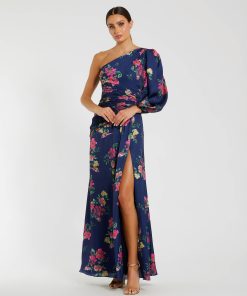 Floral one-shoulder charmeuse gown completed with a high slit and hand-sewn ruching to accent the waist.