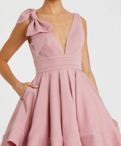 Made from delicate crepe fabric, this dress boasts a plunging v-neckline and a shoulder bow detail for added elegance. Perfect for any special occasion.