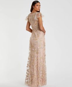 This elegant gown features intricately embroidered fabric, elegantly crafted to add a touch of sophistication to any event. The flutter sleeves and v-neckline create a flattering silhouette, making this dress a perfect choice for formal occasions.