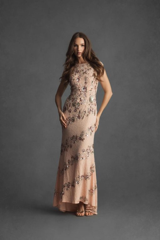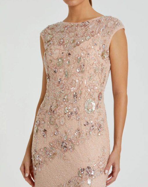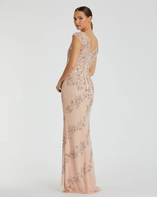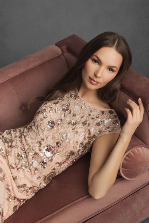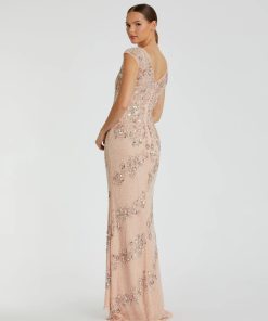 With its classic bateau neckline and delicate cap sleeves, this gown exudes timeless glamor. Perfect for formal affairs and special occasions, it’s sure to leave a lasting impression.