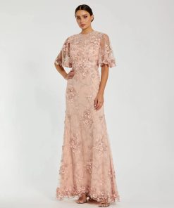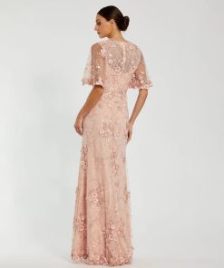 Romantic and timeless, this embroidered lace gown is a beautiful blend of classic elegance and modern detail. The bodice and skirt are fully lined for comfort, while the sheer sleeves and illusion neckline create a soft, ethereal look, making it perfect for any special occasion.