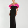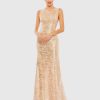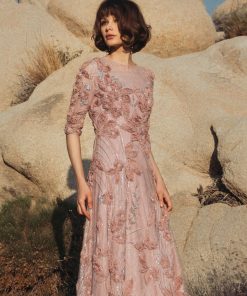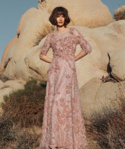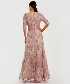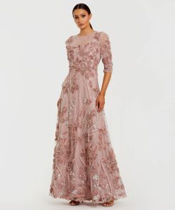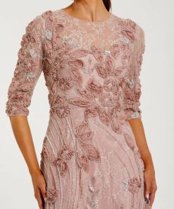 Adorned with 3D rosettes, beading, and pearls, this evening gown exudes glamour and sophistication. Featuring a high illusion neckline, sheer 3/4 sleeves, and a flattering a-line silhouette, it’s perfect for making an entrance at any formal occasion.