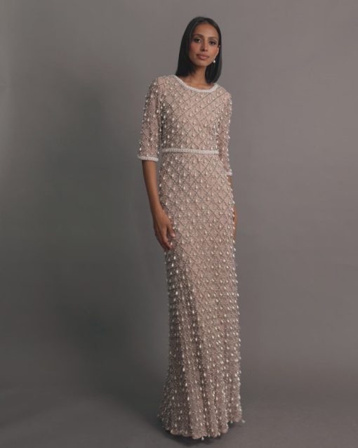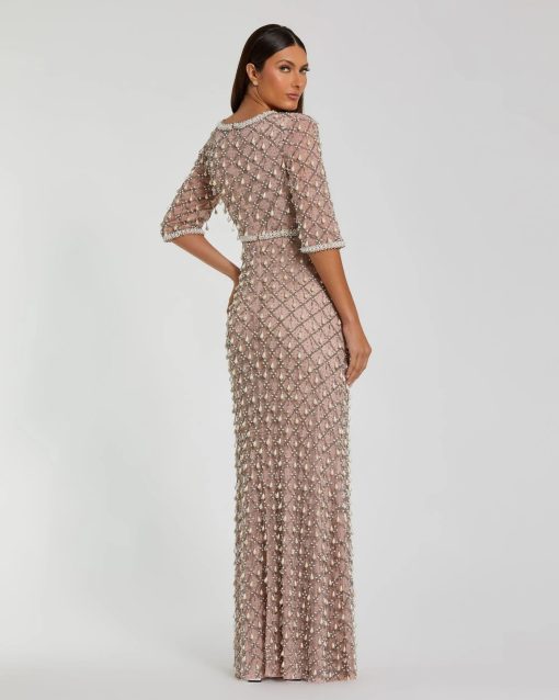 Mac Duggal Women’s Dresses Pink Pearl Embellished 3/4 Sleeve Gown | Light Rose