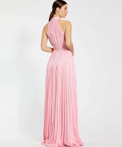 Elevate your style with our Pleated High Neck Satin Sleeveless Halter Gown. Made with luxurious pleated satin fabric, this gown features a sophisticated halter neckline and sleeveless design, sure to make a statement at any event.