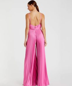 This fully-pleated wide-leg jumpsuit, crafted from luxurious silky charmeuse fabric, exudes elegance. Featuring functional pockets for added convenience, it combines sophistication with practicality, making it the perfect choice for any special occasion or stylish outing.