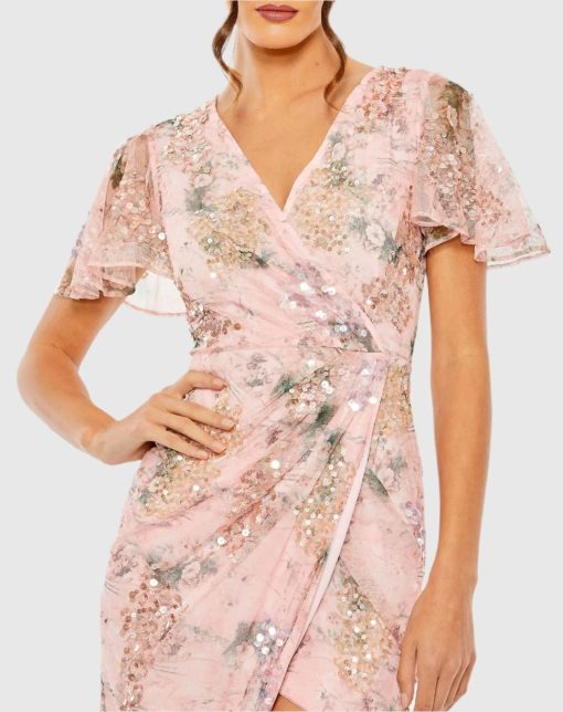 Mac Duggal Women’s Dresses Pink Printed Mesh Flutter Sleeve Faux Wrap Midi Dress | Pink