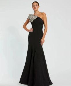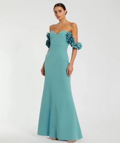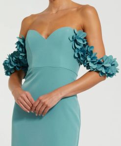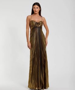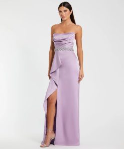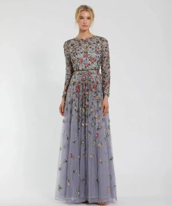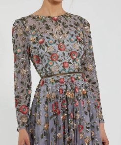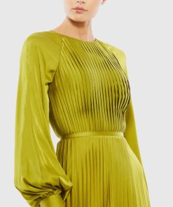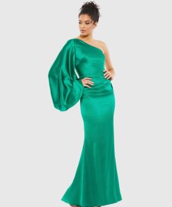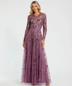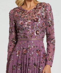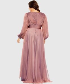 Embrace ethereal elegance in this gorgeous chiffon gown. Featuring a ruched faux-wrap waist, sheer long sleeves, and a thigh-high slit, it’s the perfect look for any special occasion.