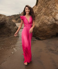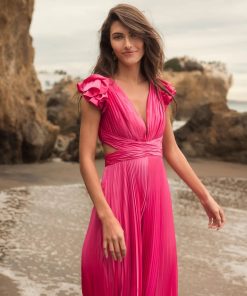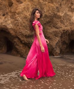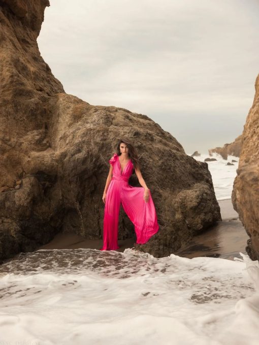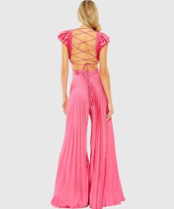 Heat pleated jumpsuit with ruffle cap sleeves and a lace-up back.