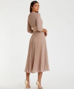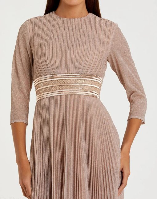Elegant 3/4 sleeve dress with an A-line pleated tea-length skirt, round neckline, and a dramatic embellished waistband.