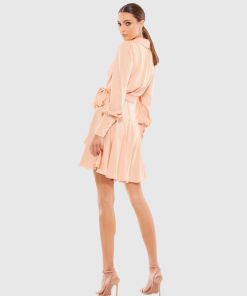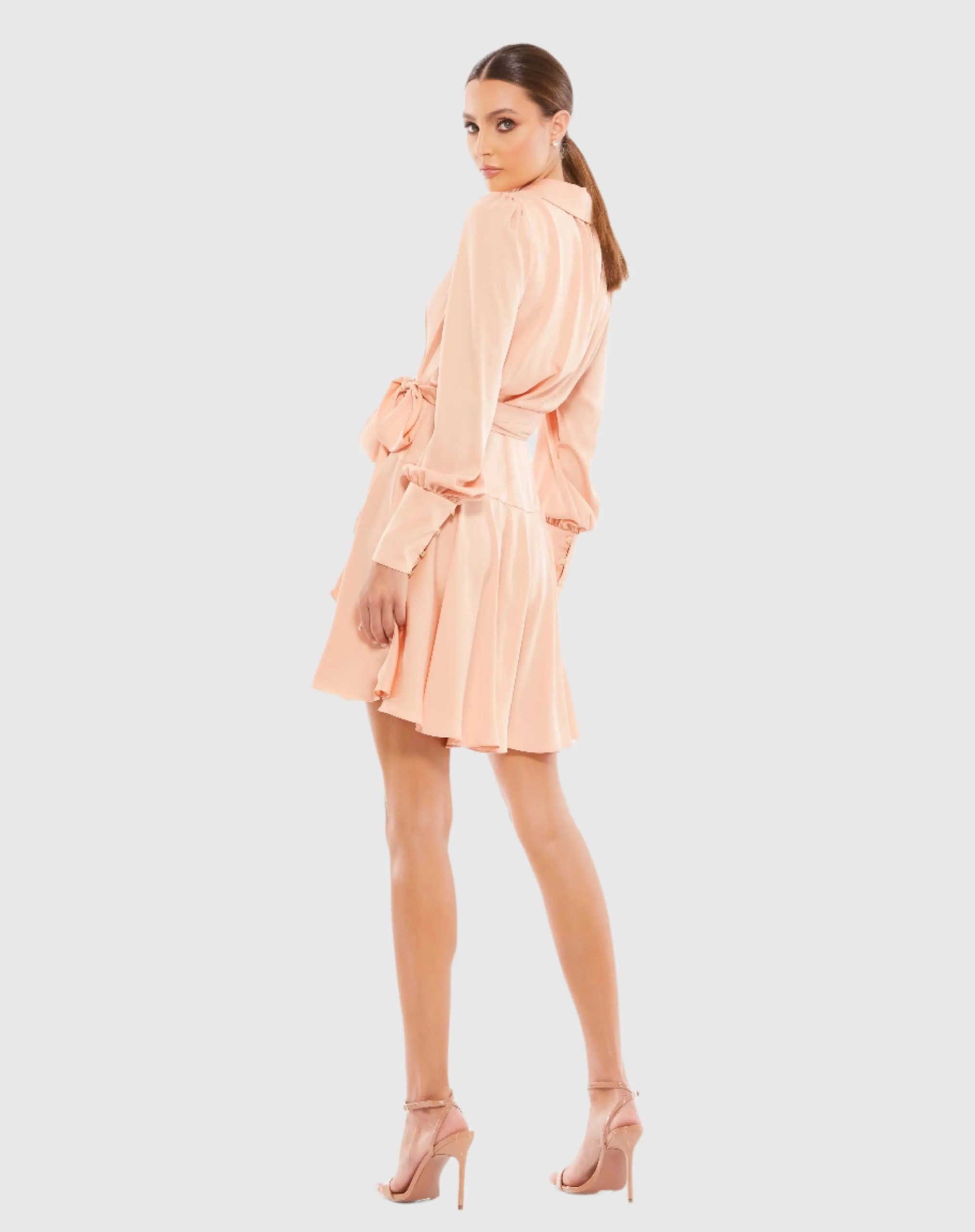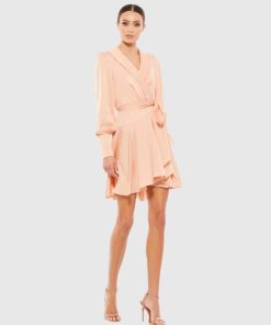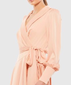 Chic long-sleeved wrap dress with a shawl lapel and flirty pleated hi-low skirt.