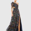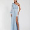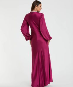 Radiate timeless elegance in this high neck satin gown. Crafted from luxurious satin fabric, this gown features rhinestone neckline detailing, long blouson sleeves and a flattering silhouette.