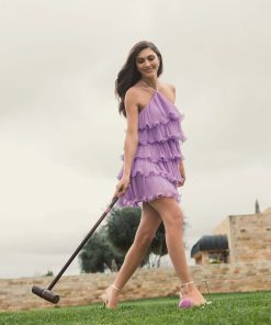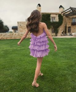 This playful purple chiffon ruffle mini dress features a tiered design and chic halter neckline, creating a fun, flirty look. Perfect for any occasion, its flowy fabric adds effortless movement and whimsy to your wardrobe.