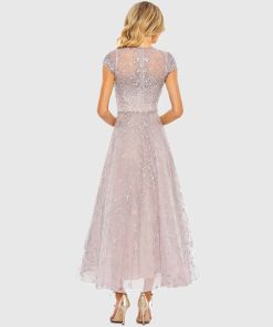 Crafted from intricately embellished tulle fabric, this a line dress features a partial lining for a hint of sheer elegance. The sweetheart illusion neckline and delicate cap sleeves add a sophisticated touch to this timeless piece, making it perfect for any formal occasion.