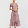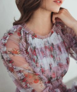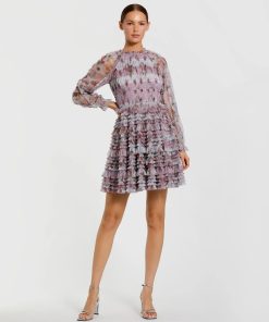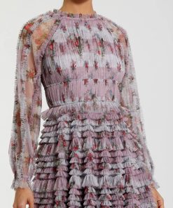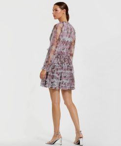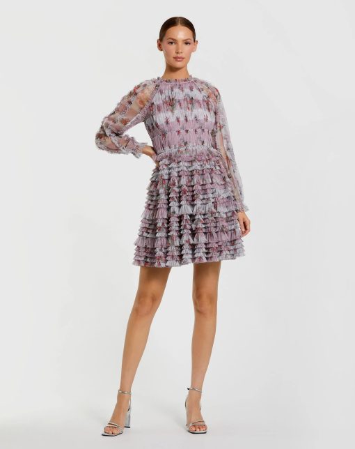 Featuring a romantic floral print, delicate sheer long sleeves, and a playful ruffle tiered skirt, this dress is perfect for daytime events and cocktail parties.