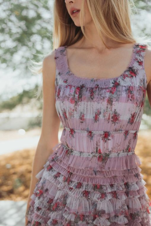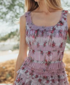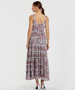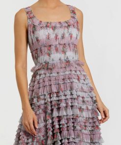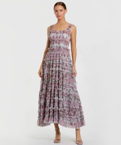 Be the first to review “Mac Duggal Women’s Dresses Purple Sleeveless Floral Midi Dress With Tiered Ruffles | Purple Multi” Cancel reply