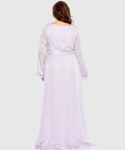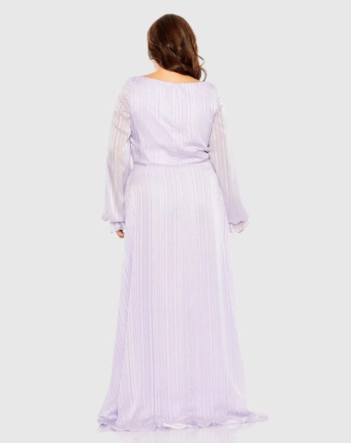 Perfect for weddings and other special occasions, this beautiful gown features a v-neckline, semi-sheer long sleeves, and a playful asymmetrical ruffle hem.