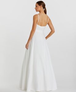 This timeless ballgown features a flattering V-neckline, delicate spaghetti straps, a sleek square back, and a chic belted waist. The full A-line skirt, layered with tulle, adds structure and elegance, making it the perfect choice for formal events.