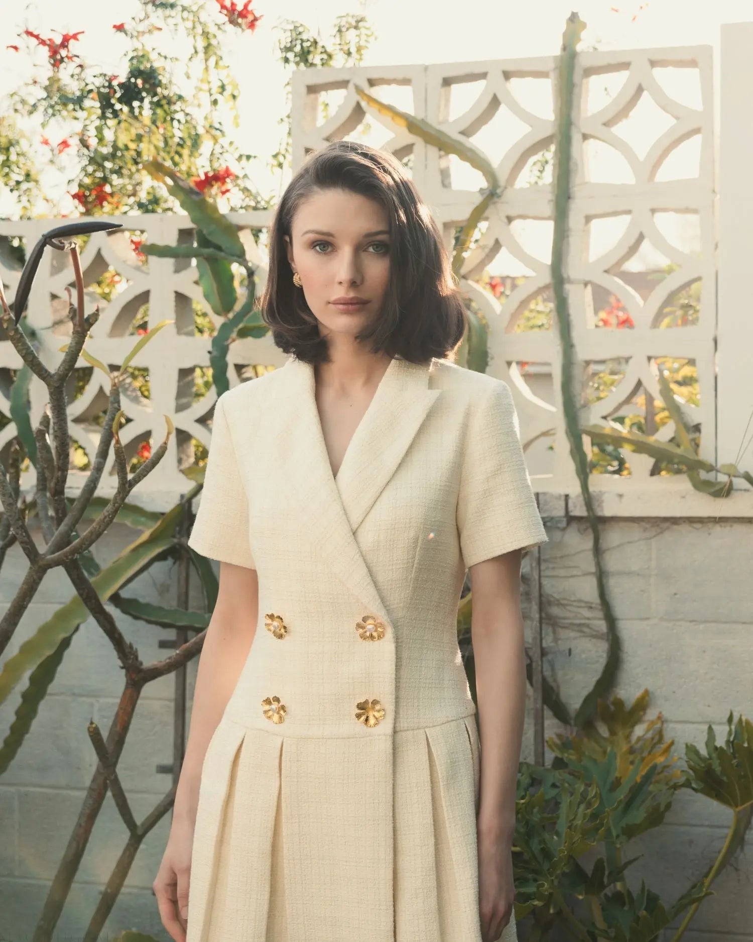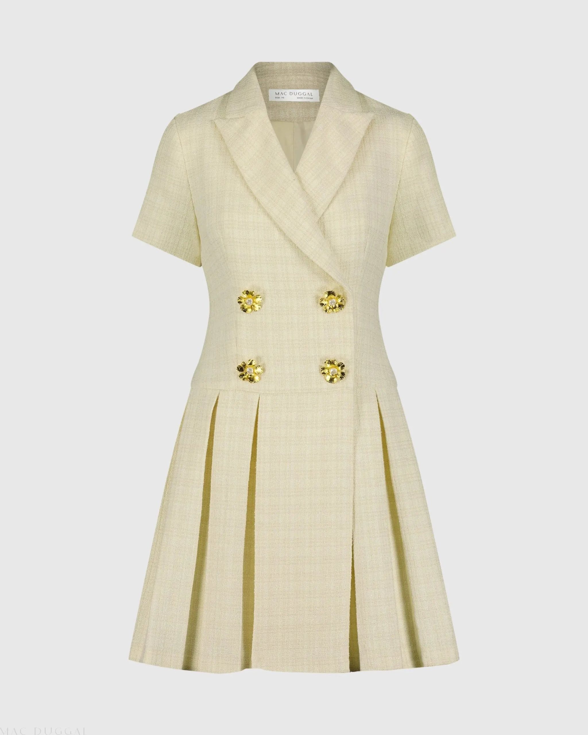 Elevate your wardrobe with our Short Sleeve Tweed Blazer Mini Dress. This chic ensemble combines the sophistication of a blazer with the playful charm of a mini dress. With its short sleeves and tailored silhouette, this dress offers both style and comfort. Step out in confidence with this versatile and fashion-forward piece.
