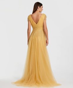 Mac Duggal Women’s Dresses Yellow Embellished Cap Sleeve V Neck Tulle Gown | Gold