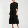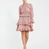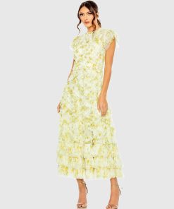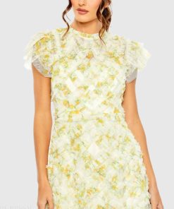 This enchanting dress features a floral-printed mesh overlay, adding a soft, romantic touch. The partially lined bodice and fully lined skirt ensure comfort, while the sheer unlined sleeves offer an airy, delicate feel. The illusion high neckline enhances the sophisticated design, and the short ruffled cap sleeves provide a playful, feminine touch. Allover ruffled frill detailing and an A-line silhouette complete the look, creating a flattering and elegant style perfect for weddings, garden parties, or any special occasion.