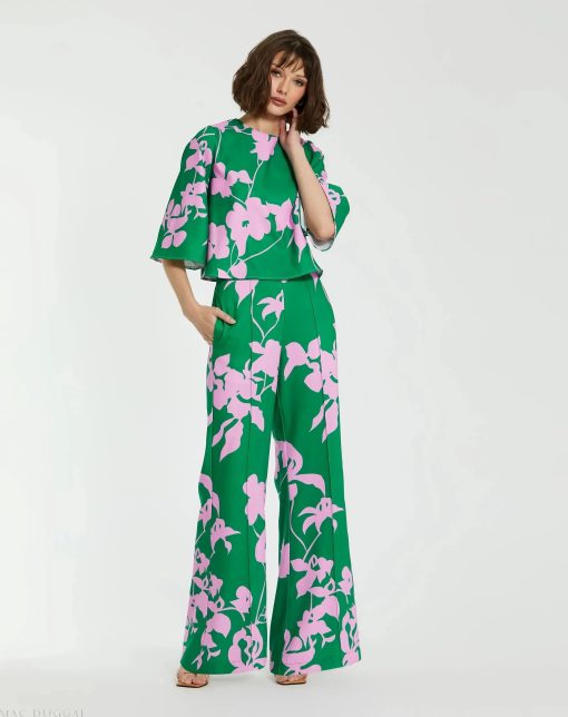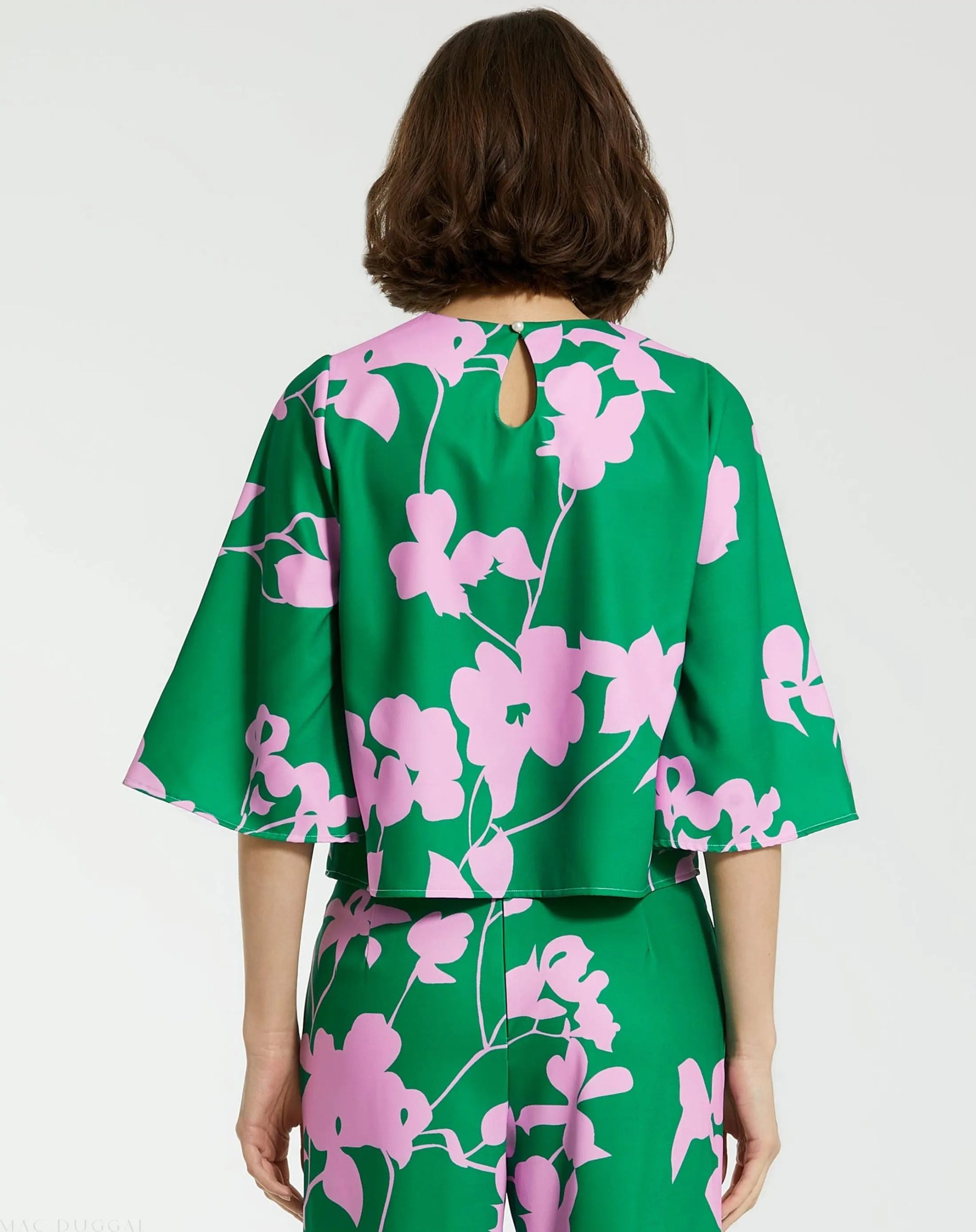 Mac Duggal Women’s Green Printed Crepe 3/4 Bell Sleeve High Neck Top – Final Sale | Green Multi