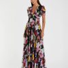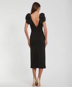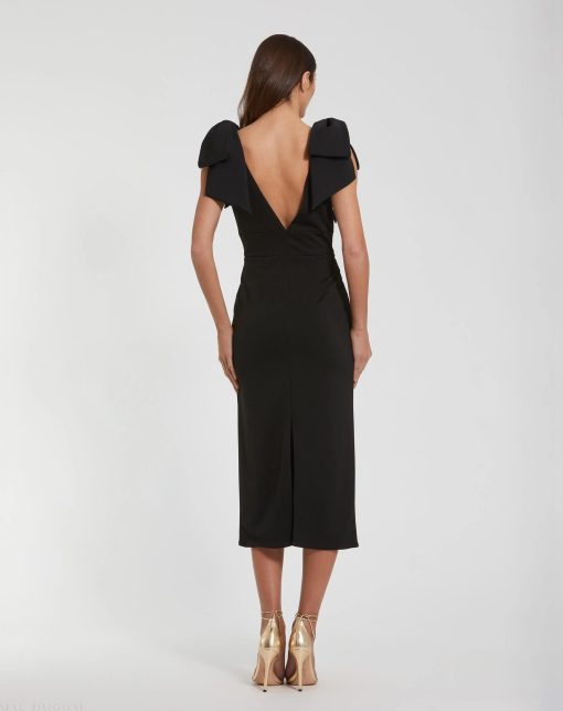 This elegant crepe dress offers a sleek, flattering fit with a v-neckline, sleeveless design, and eye-catching bow shoulder detailing for added feminine charm.