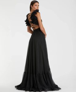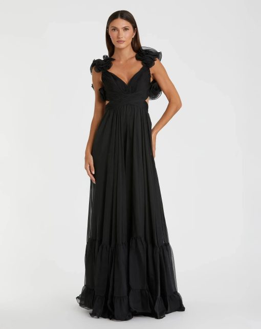 The Mac Duggal Iconic Ruffle Gown. Floor length tiered gown with daring side cutouts, a lace-up back, and dramatic ruffles at the shoulder. This best selling silhouette is flattering on most body types and easily adjustable for the best fit.