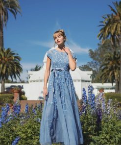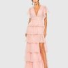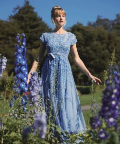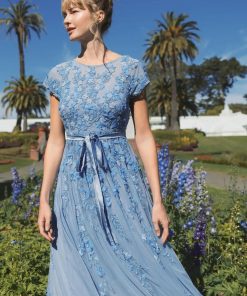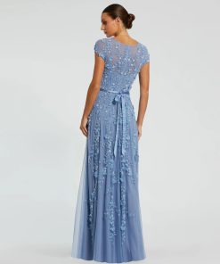 This embellished gown boasts a high neckline and cap sleeves, making it both elegant and stylish. Crafted from an embellished mesh fabric, this gown pairs intricate detailing with a classic silhouette. Perfect for any formal occasion, it will surely make a statement.