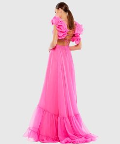 The Mac Duggal Iconic Ruffle Gown. Floor length tiered gown with daring side cutouts, a lace-up back, and dramatic ruffles at the shoulder. This best selling silhouette is flattering on most body types and easily adjustable for the best fit.