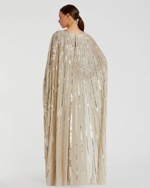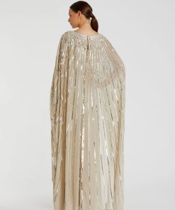 The Embellished Column Cape Gown by Mac Duggal offers a stunning, fully lined bodice and skirt, with a sheer, unlined cape overlay with hand beaded and sequin details. The boat neckline and cape sleeves create an elegant silhouette, while the asymmetrical cape overlay and sweeping train add a touch of drama.