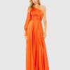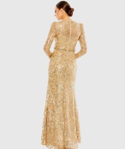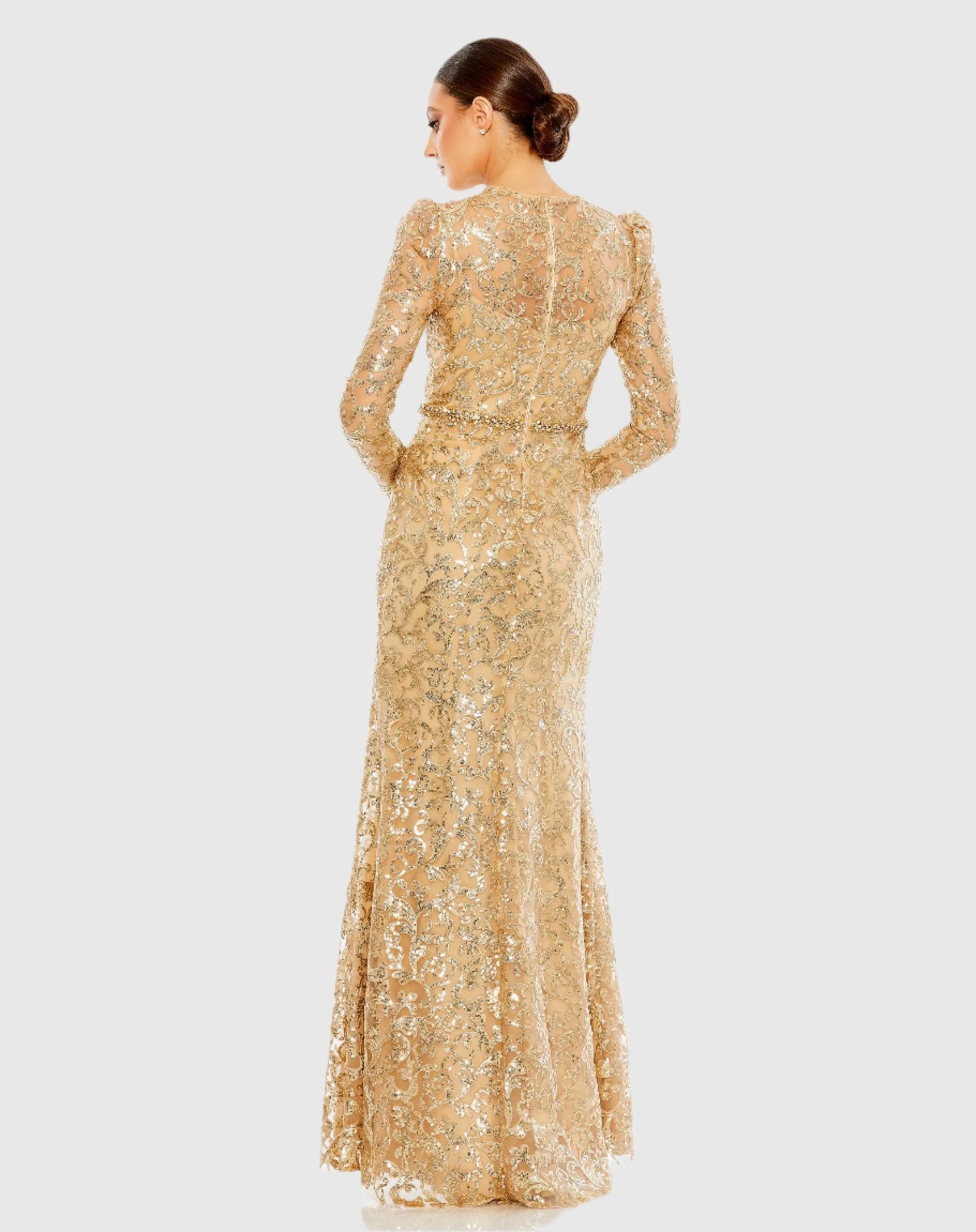 Crafted from embroidered fabric, this elegant gown features a partially lined bodice, a fully lined skirt, and unlined sleeves. The illusion high neckline and long sleeves exude sophistication, while the beaded waist detail adds a subtle touch of glamour. Perfect for formal events and special occasions.