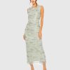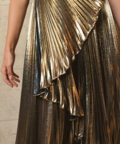 This stunning Pleated Metallic One Shoulder High Low Gown features a unique one shoulder neckline. The pleated metallic fabric adds a touch of glamour, while the high low ruffle hem adds a modern and chic twist. Perfect for any special occasion, this gown is sure to turn heads.