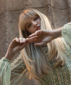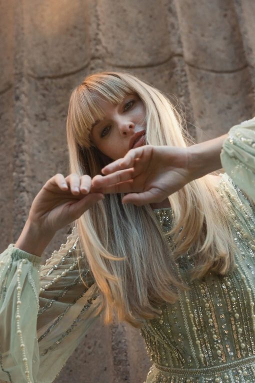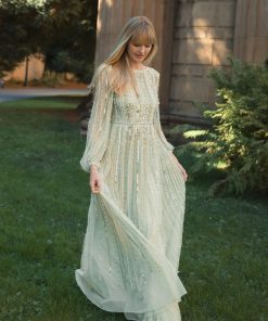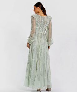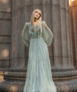 This sophisticated hand-embellished and beaded gown features a luxurious sequin overlay with intricate striped beading of pearls, sequins, and beads, elegantly finished with sheer bishop sleeves—an exquisite choice for daytime weddings or refined, modest occasions.