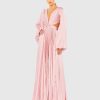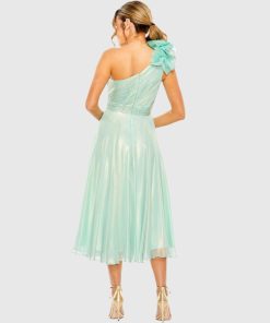 This gorgeous tea length dress features a delicate organza fabric and a pleated bodice, exuding elegance. The asymmetrical one-shoulder neckline adds a modern touch, while the ruffled rosette shoulder detail creates a stunning accent. Perfect for any special occasion.