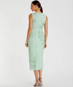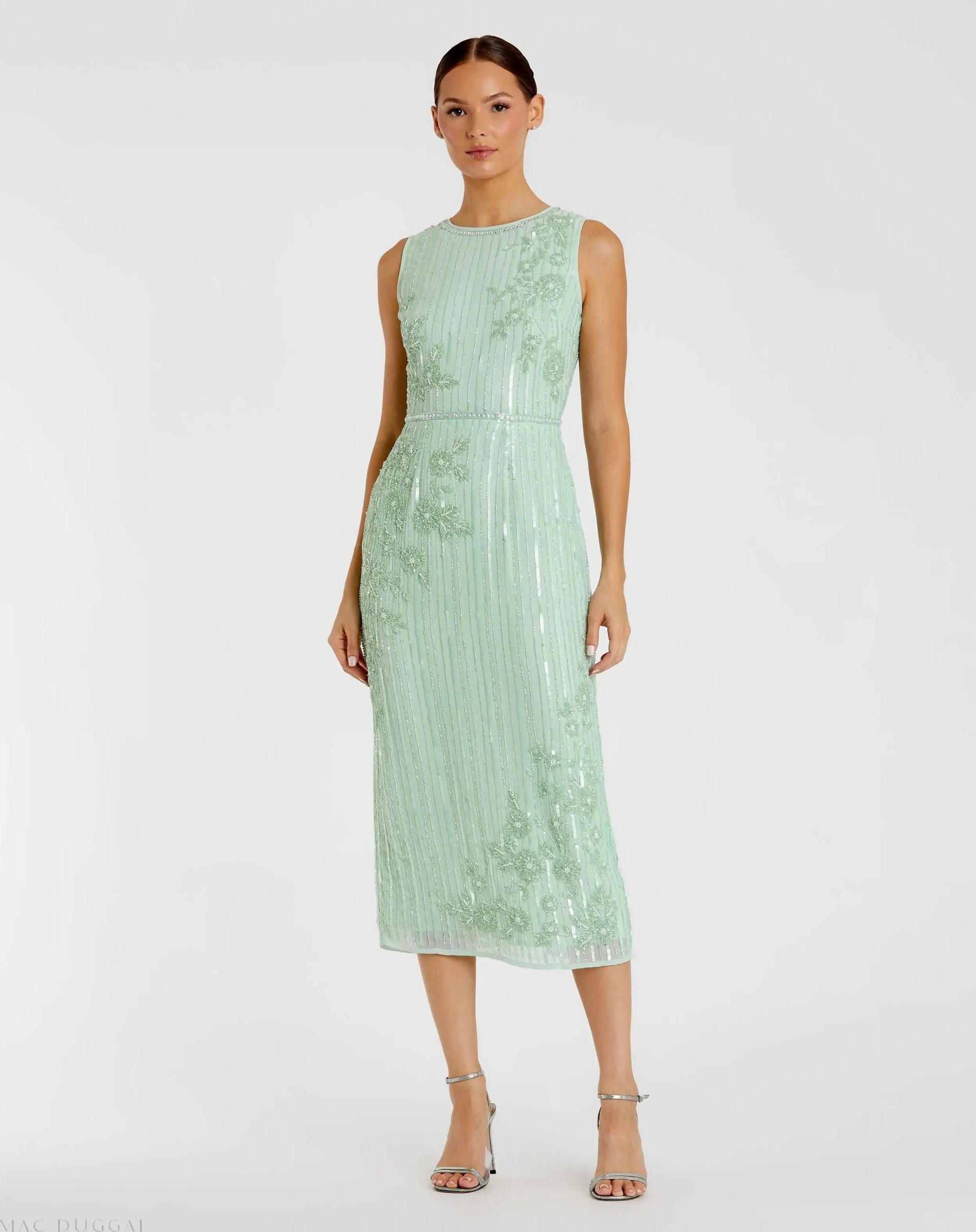 Chic sleeveless midi dress with rows of vertically-striped sequins throughout. Intricate, hand-beaded flowers adorn the bodice and skirt, and crystals accent the neckline and waist.