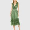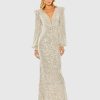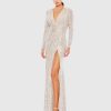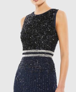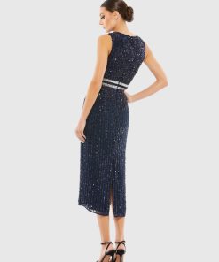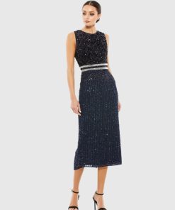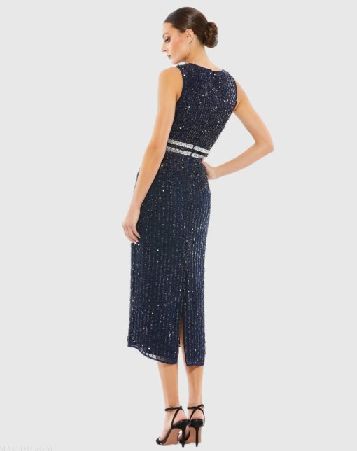 Elegant vertical-sequined sleeveless midi sheath dress with a flattering hand- beaded waist and back vent slit.