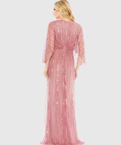 Crafted with a delicate net fabric, this gown exudes elegance. Featuring a V-neck and kimono sleeves, it sets the stage for an effortlessly sophisticated look. The sequin detailing adds a touch of sparkle, making it a perfect choice for any special occasion.