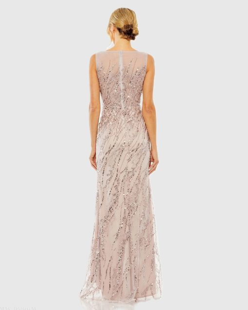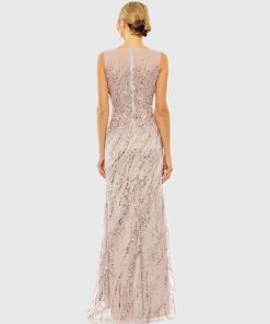 This elegant gown features a hand-embellished mesh overlay with a sheer illusion neckline and sleeveless design. The angled pattern of hand-stitched sequins and beads adds a stunning, shimmering effect, making it perfect for a formal occasion.