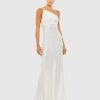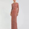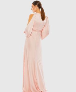 Flowing gown with a plunging self-tie keyhole neckline, pleated waistband, and cold-shoulder long sleeves.
