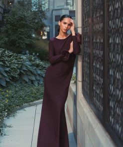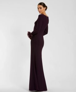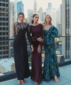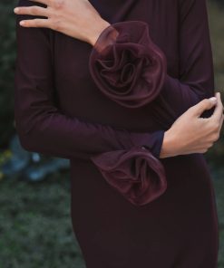 This long sleeve fitted gown features a boat neckline and elegant 3D flower accents, creating a stunning and sophisticated look. Crafted from soft jersey fabric, it offers both comfort and style.