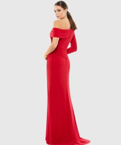 This stunning jersey gown features an asymmetrical off-the-shoulder neckline and a single long sleeve for a bold and modern look. The ruched gathered waist enhances the figure, while the faux wrap design with a thigh-high slit adds a touch of allure and sophistication. A sweeping train completes the elegant design. Perfect for formal events, galas, or special occasions.