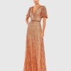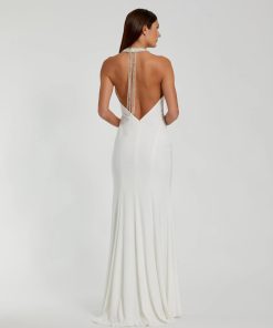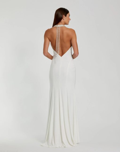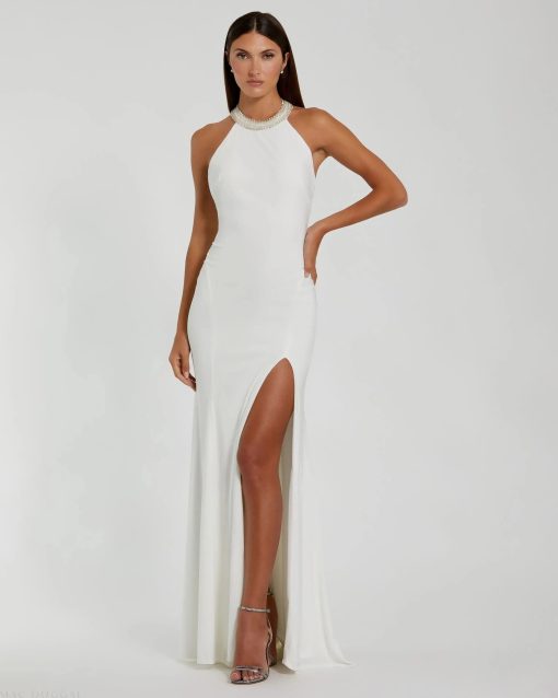 Elegant jersey gown accented with a bead-and-rhinestone embellished halter neck and a thigh-high slit.