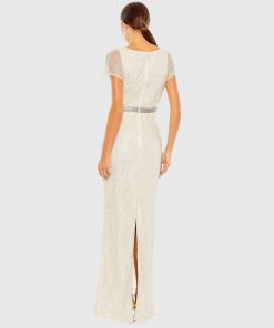 Introducing our Beaded Short Sleeve Column Gown, a vision of elegance and allure. With a sheer hand-embellished mesh overlay and fully lined silhouette, it features a flattering V-neckline and delicate short sleeves. Adorned with an all-over lattice beaded pattern and a rhinestone encrusted waist detail, this gown exudes timeless sophistication for your special occasion.